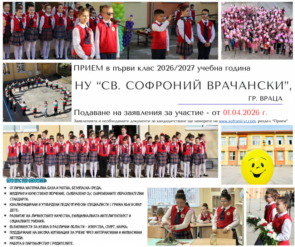 Критерии за осъществяване на прием в първи клас в НУ „Св. Софроний Врачански“, гр. Враца за учебната 2026/2027 година |