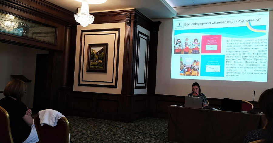 Голям интерес представляваше презентацията, с която г-жа Пойчева сподели добри практики при реализираните качествениE-twinning проекти „Нашата първа аудиокнига“ и „Пътешествието на Читателски STEAM клубове“.