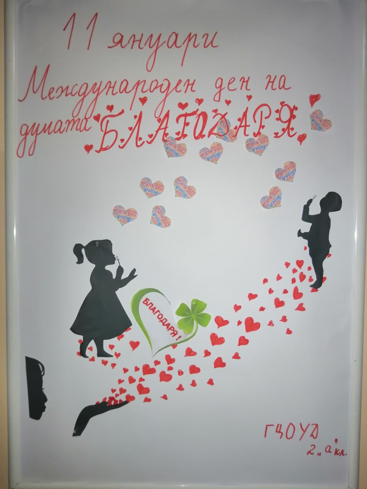 В световният ден на най-красивата дума „Благодаря“, с много емоции и вълнение учениците от 2.а клас изразиха своите най-искрени благодарности като изработиха картички с послания за своите родители, рисунки за класната стая и постер.