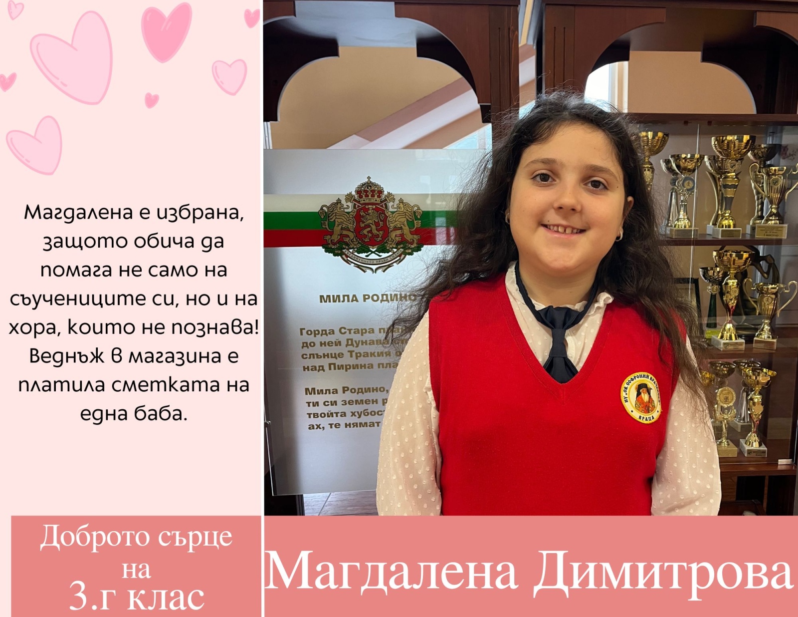 Приз „Добро сърце“ е ежегодна инициатива на ДП „Детство без тревоги“, в която участват по един ученик от всeки втори, трети и четвърти клас. Те са избрани от своите ученици чрез гласуване, благодарение на добрите постъпки, които имат. Посочените ученици се отличават с благородни и хуманни жестове, примерно поведение и качества, които не могат да се измерят по друг начин, освен през чистия поглед на своите съученици. Всички предложения участват в училищно явно гласуване, при което учениците могат да подкрепят единствено кандидатурите на останалите класове.