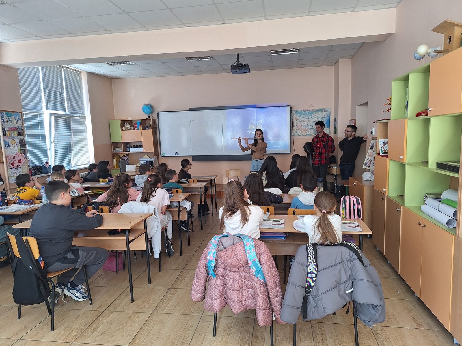 На 20 март музиканти от Симфониета Враца посетиха нашето училище и представиха на децата някои от музикалните инструменти-цигулка, виолончело, флейта и любимия на всички деца - барабан.