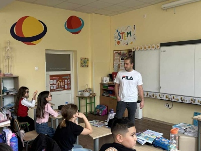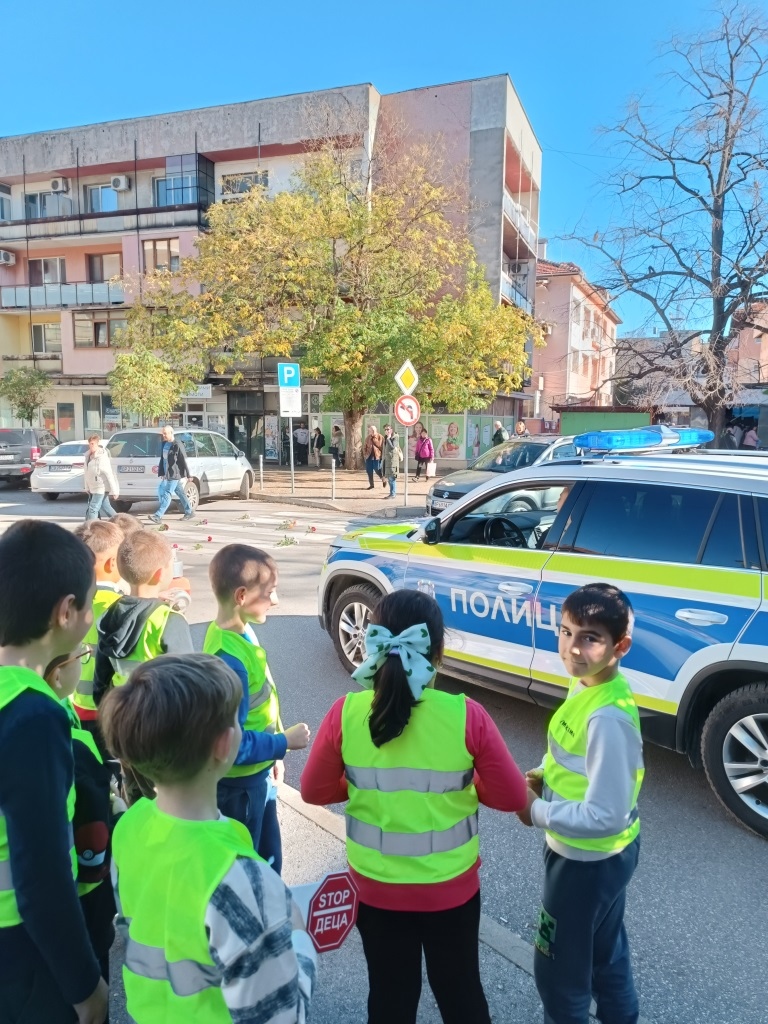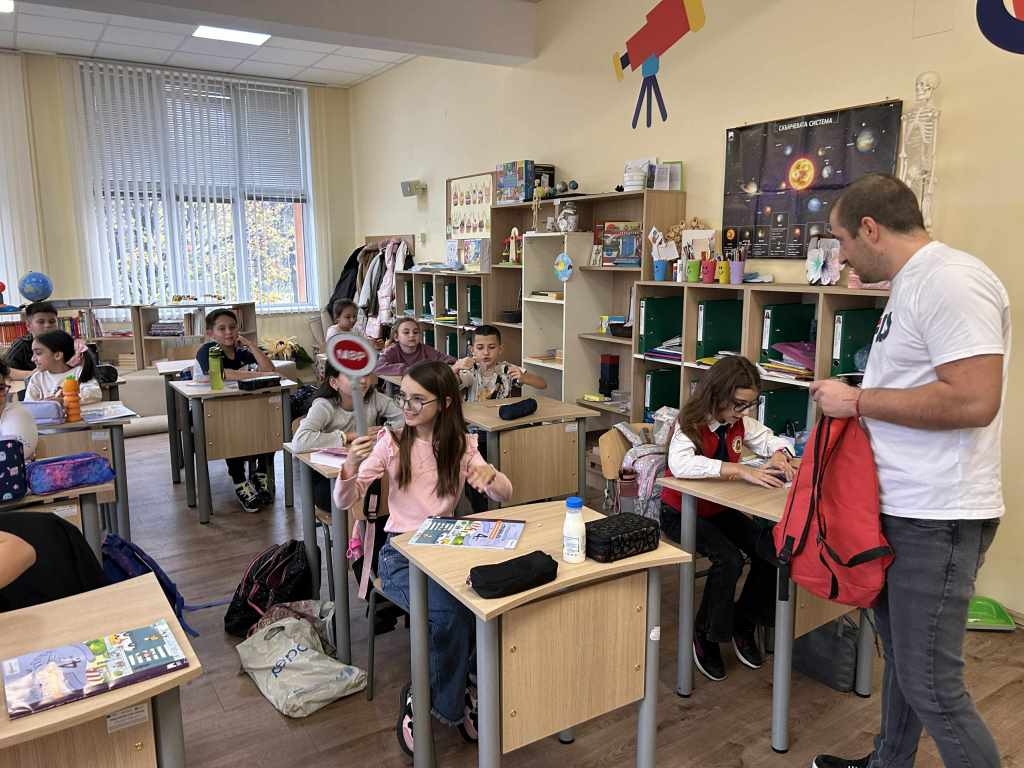Инициативата продължи в 4.б клас с беседа, водена от полицай. Той разясни на децата основните правила за пътна безопасност и им показа какви могат да бъдат последиците от тяхното неспазване. Сподели и за своята професия – една от най-отговорните и рисковани, свързана с опазването на живота и сигурността на гражданите.