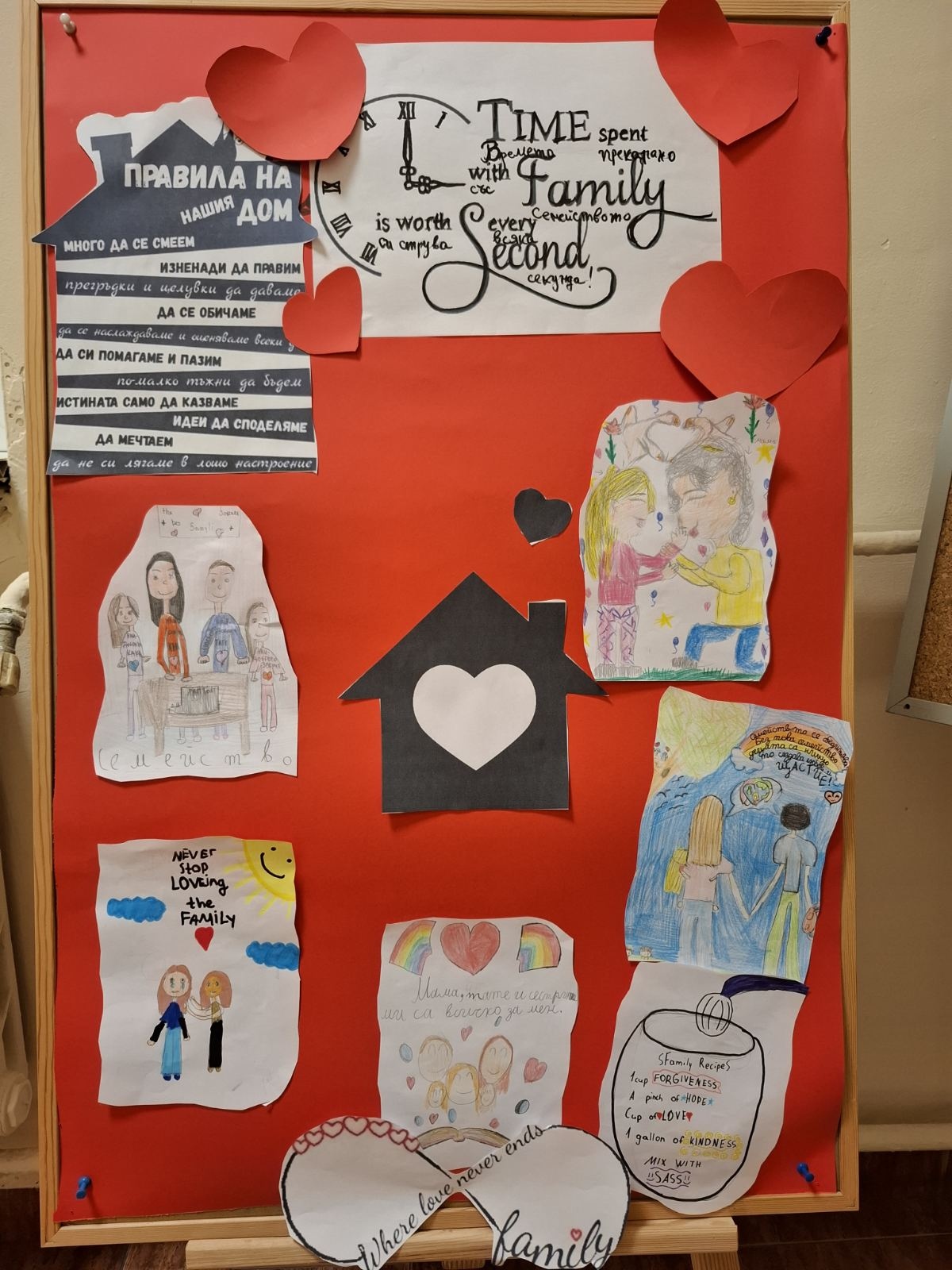 В духа на малко бинарно обучение включихме и английски език, като превеждахме думи, свързани със семейството и добротата – family, love, respect, kindness, hug. Така чрез изкуство и език учениците показаха, че щастието се „готви“ с разбирателство, споделеност и искрени чувства.