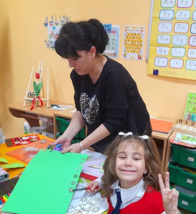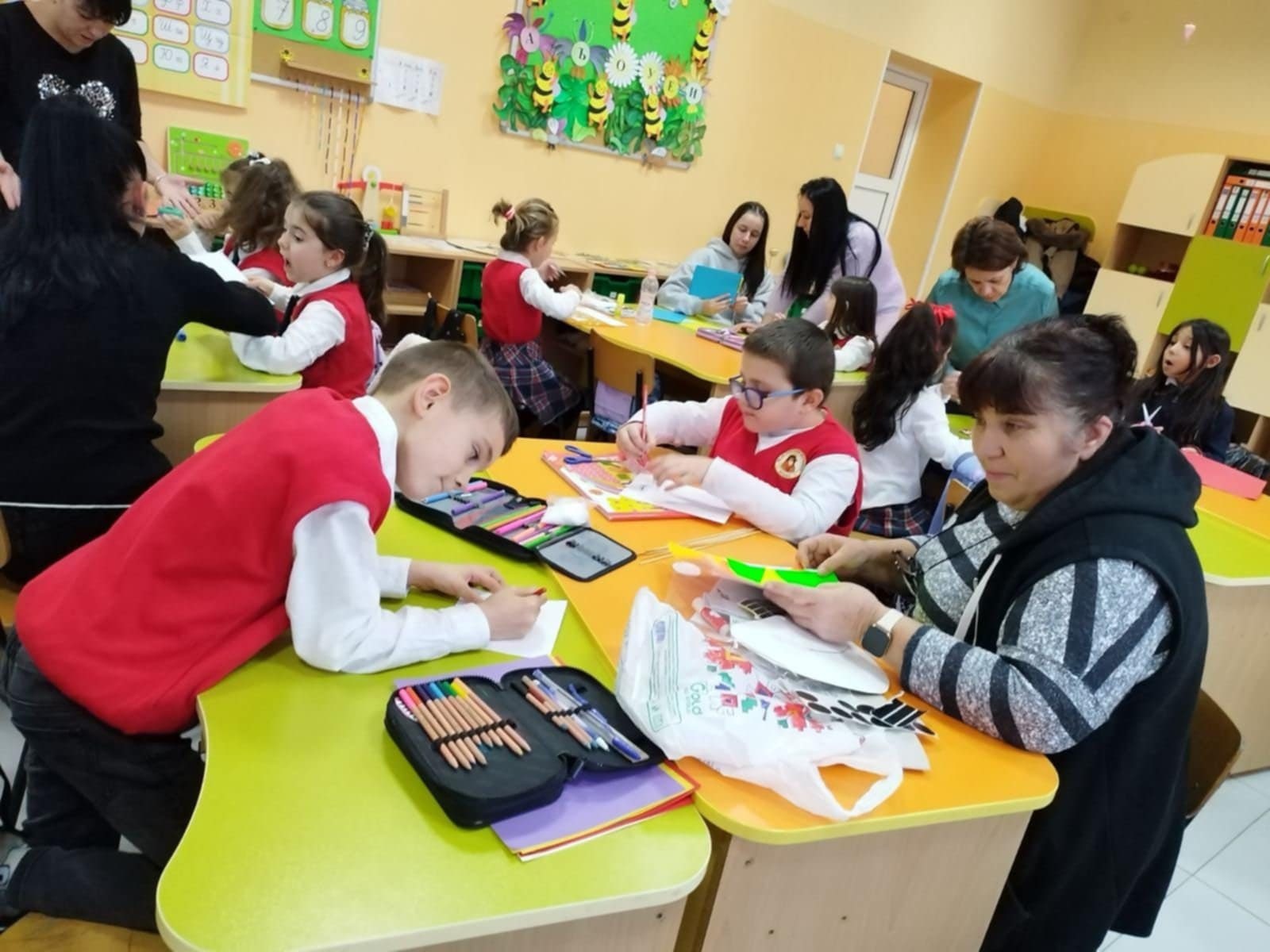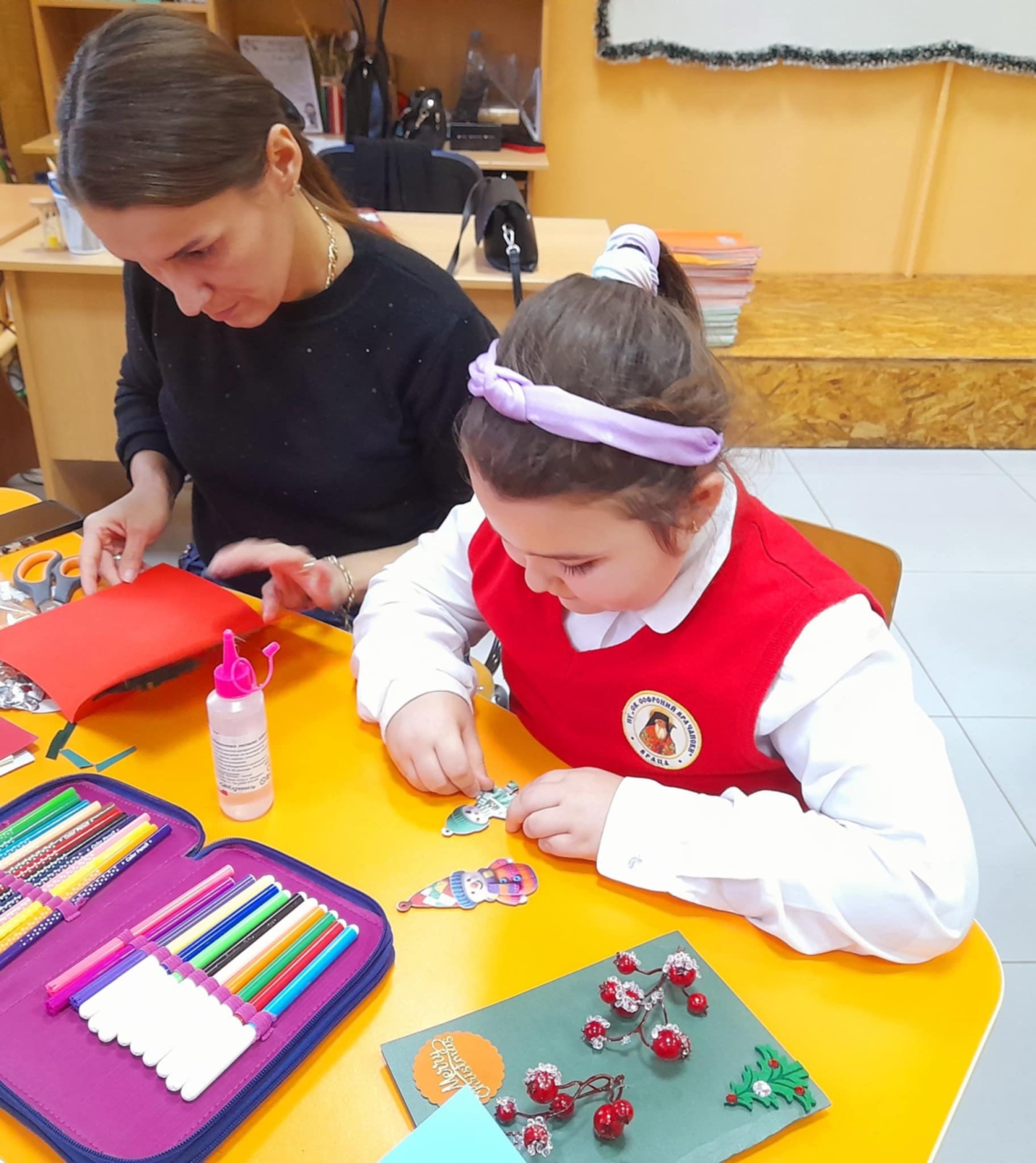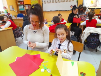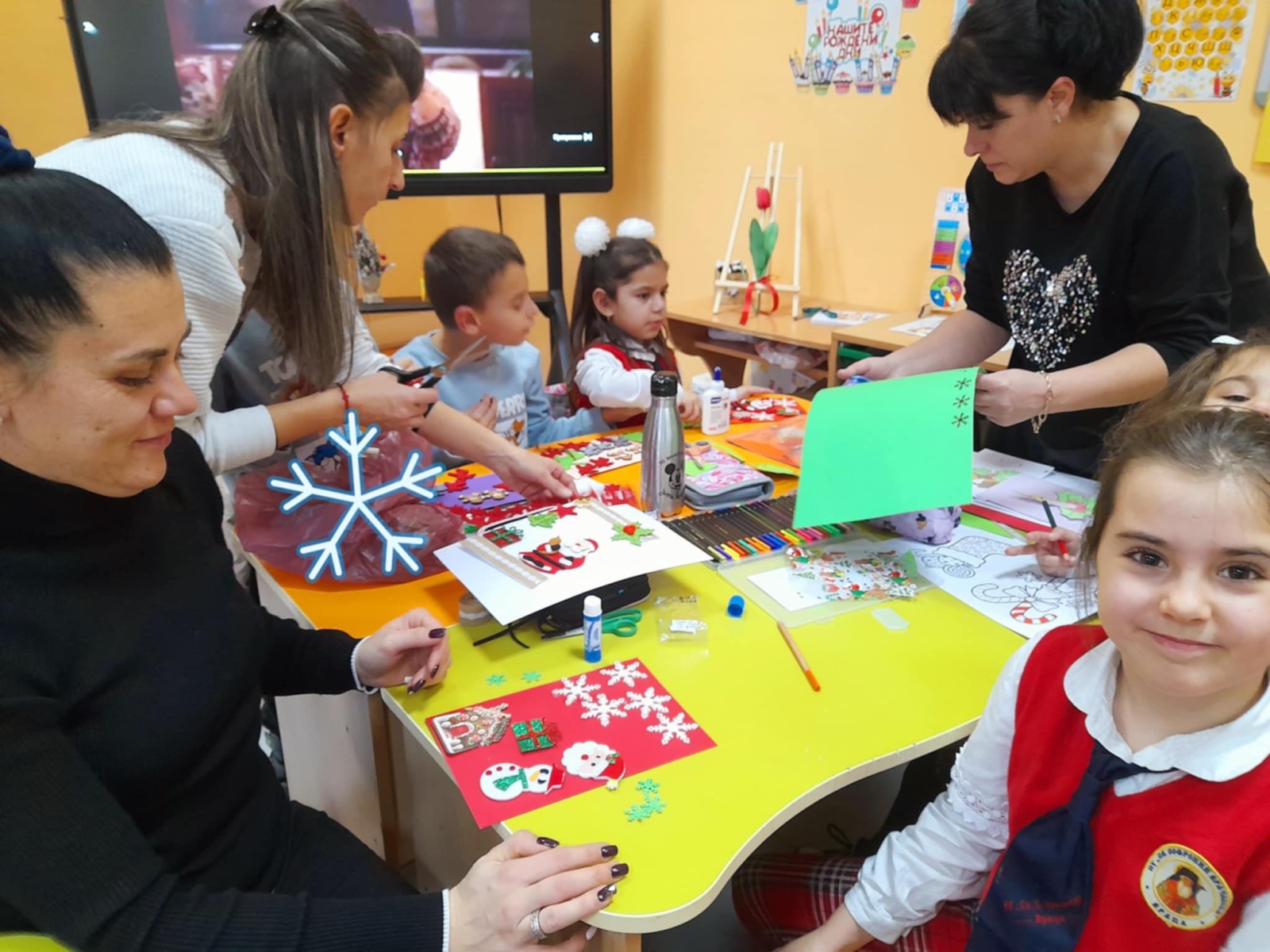 Класната стая се превърна в истинска коледна магия – украсена с цветни гирлянди, елхички и празнично настроение. Децата, заедно със своите родители, изработваха коледни картички. Работата вървеше с много ентусиазъм, смях и взаимопомощ.