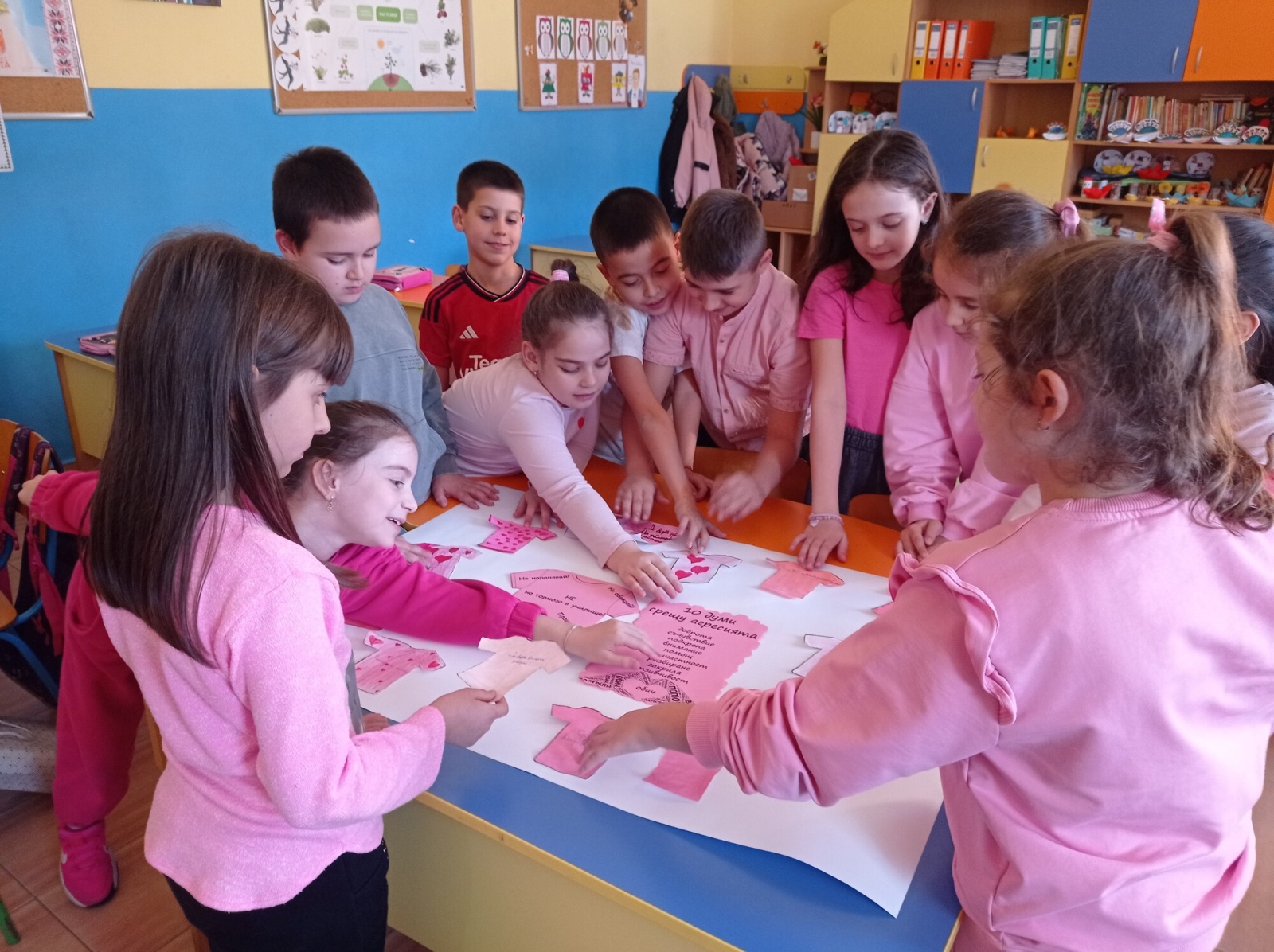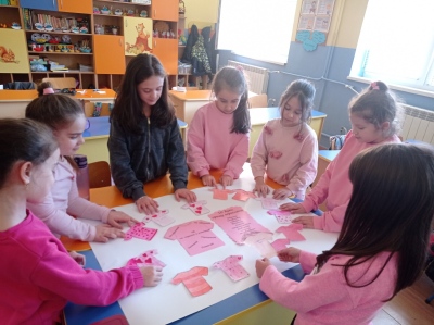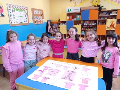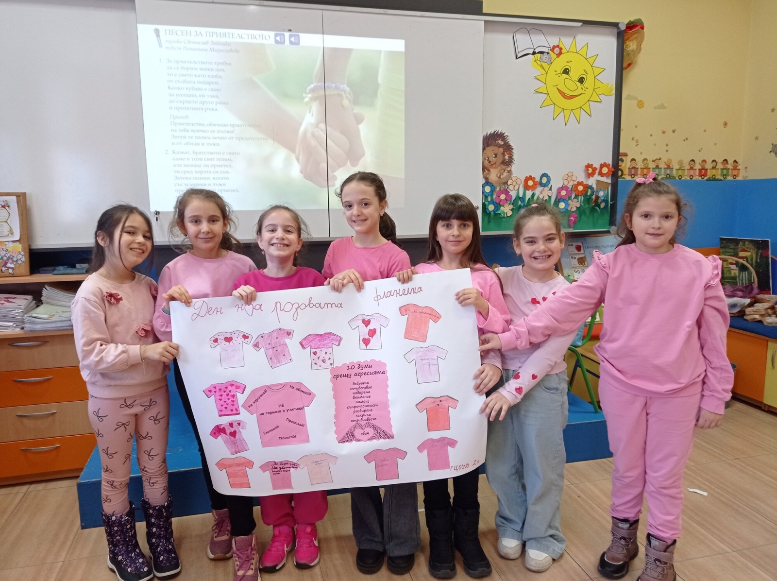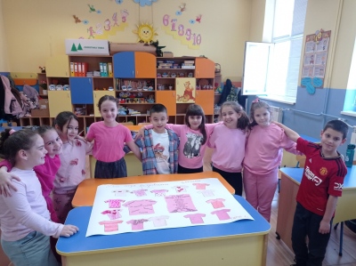 На 25 февруари учениците от 2.г клас в група за целодневна организация отбелязаха Деня на розовата фланелка – ден за съпричастност, уважение и противопоставяне на агресията. С много старание и усмивки децата изработиха постер с розови фланелки, върху които написаха послания за доброта и приятелство. Заедно подбраха 10 думи срещу агресията, които показват, че доброто отношение и разбирателството са по- силни от грубите думи и лошите постъпки. Празничната атмосфера беше допълнена и с песен за приятелството.