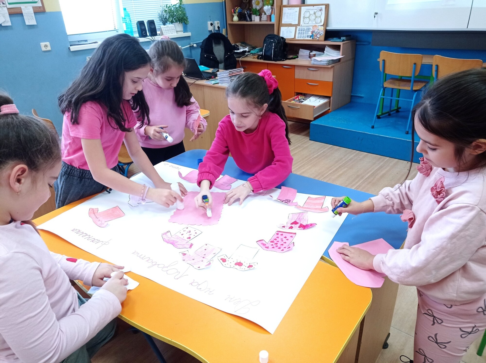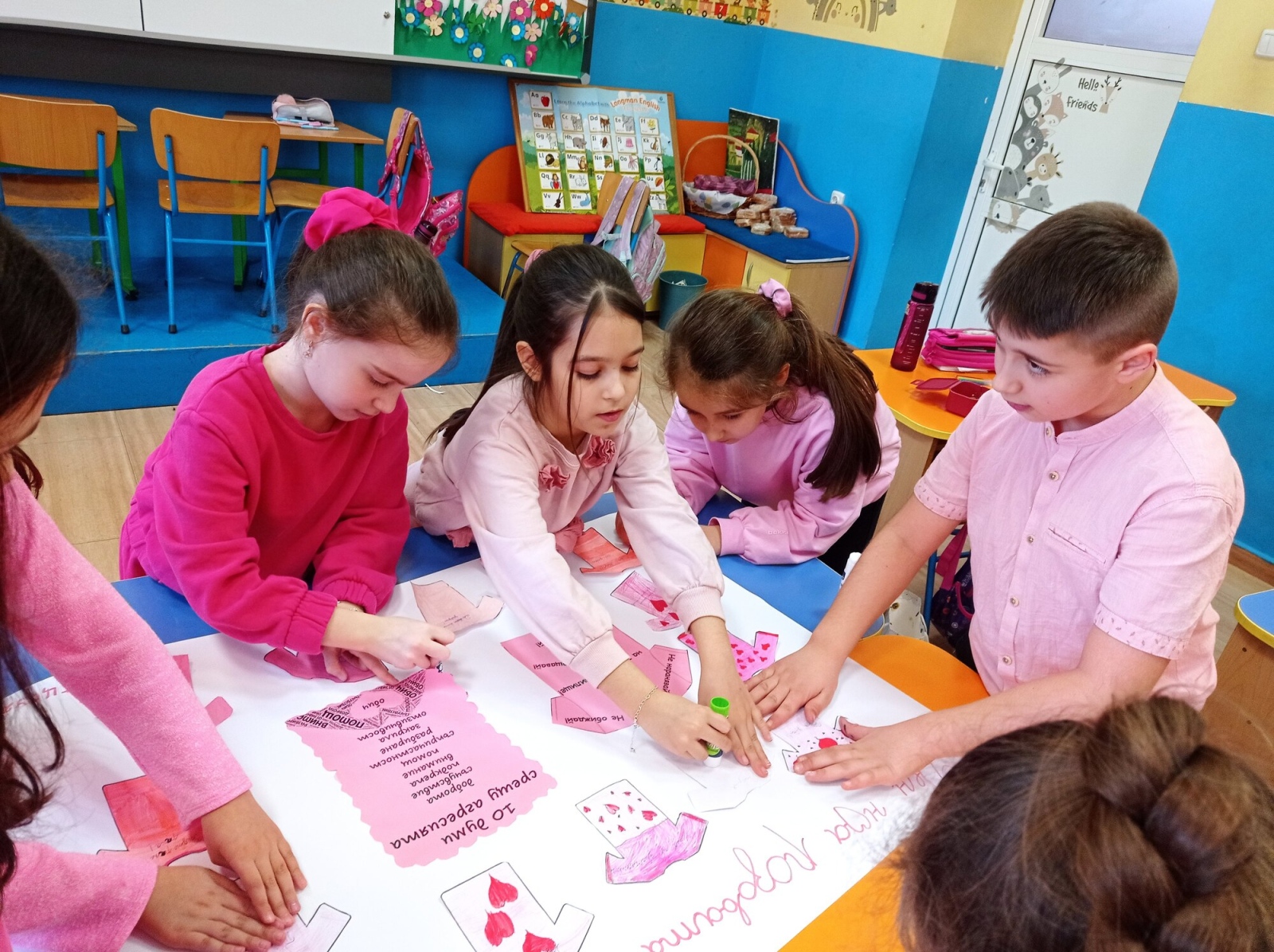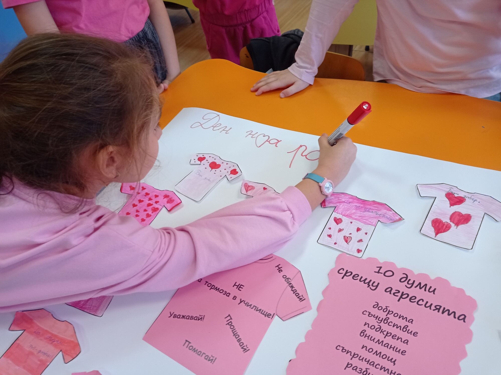 На 25 февруари учениците от 2.г клас в група за целодневна организация отбелязаха Деня на розовата фланелка – ден за съпричастност, уважение и противопоставяне на агресията. С много старание и усмивки децата изработиха постер с розови фланелки, върху които написаха послания за доброта и приятелство. Заедно подбраха 10 думи срещу агресията, които показват, че доброто отношение и разбирателството са по- силни от грубите думи и лошите постъпки. Празничната атмосфера беше допълнена и с песен за приятелството.