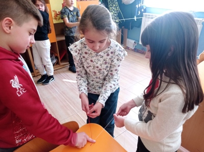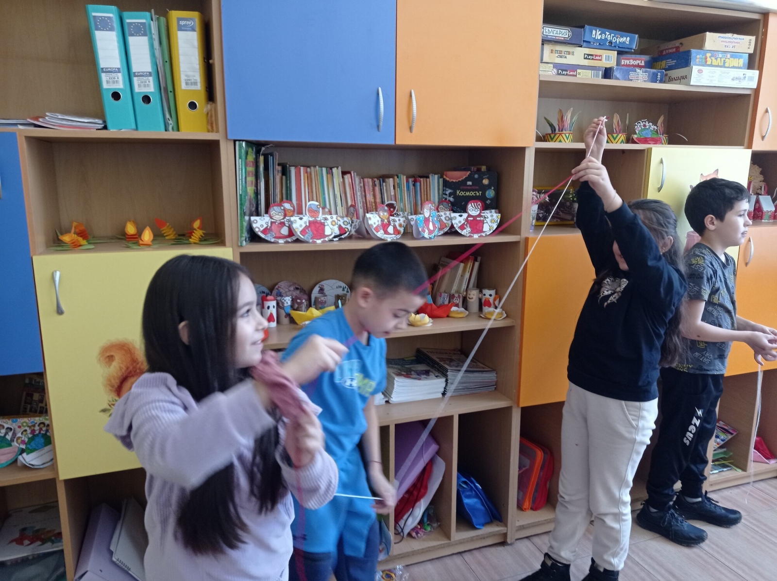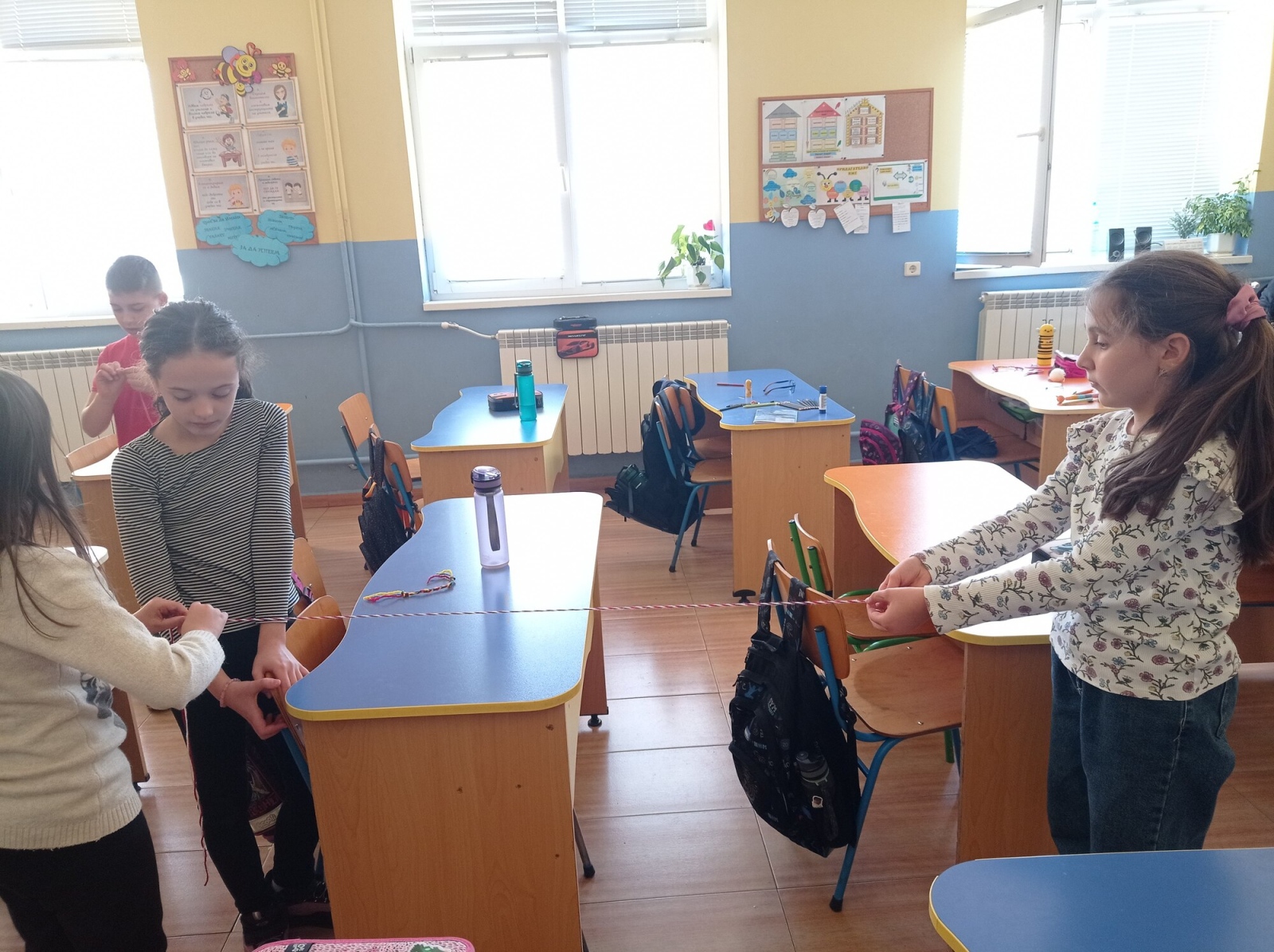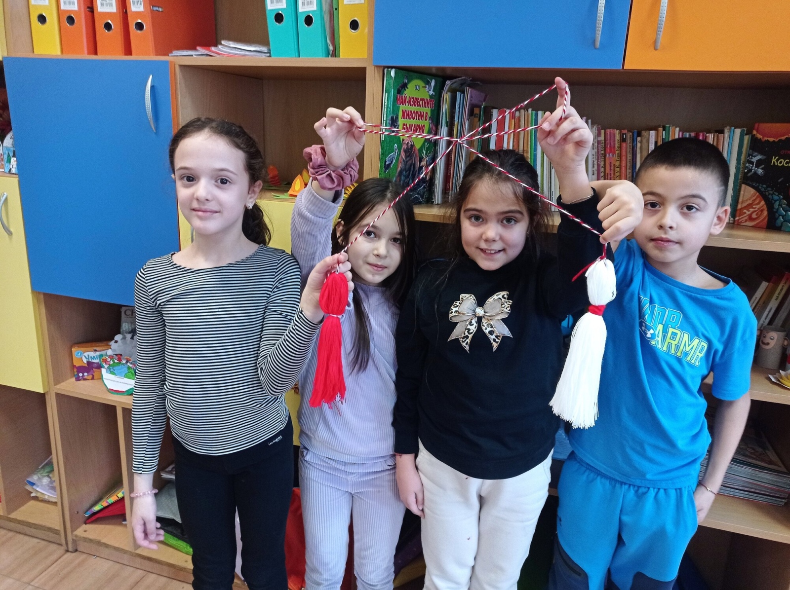 Децата изработиха мартеници, като усукваха бели и червени конци и оформяха шнурчета и малки фигурки. По време на дейността учениците показаха сръчност, старание и интерес.