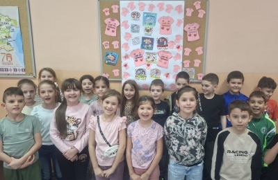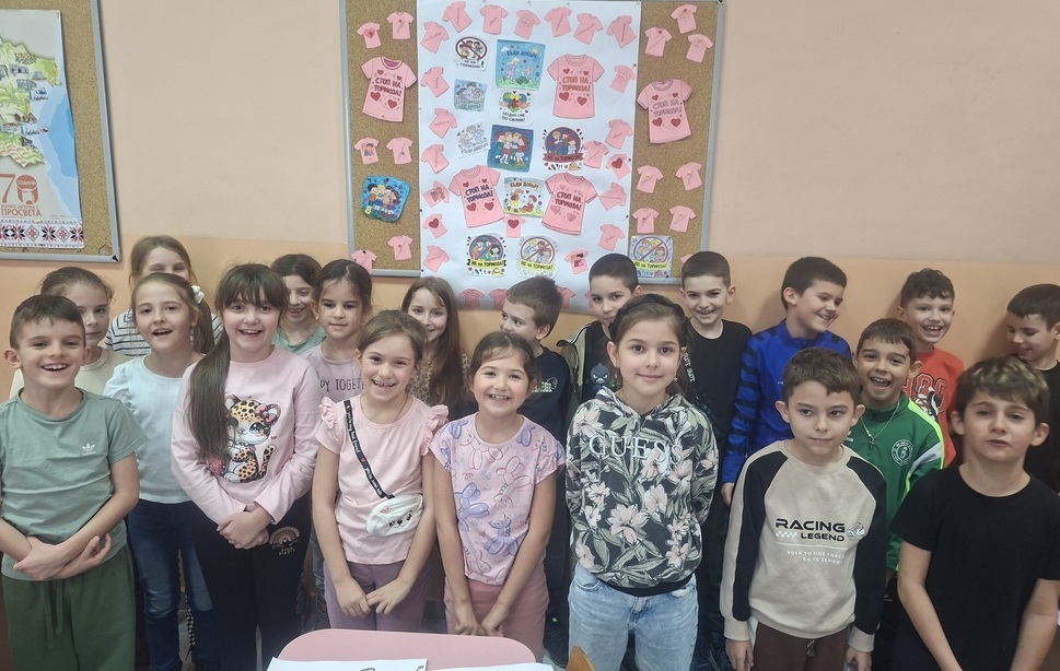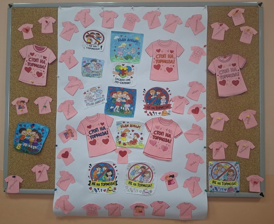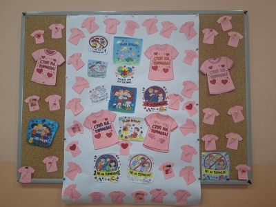 Учениците от групата подготвиха постер в класната стая , някой от тях носят розово, за да символизират своята позиция на неприемане на тормоза в училище.