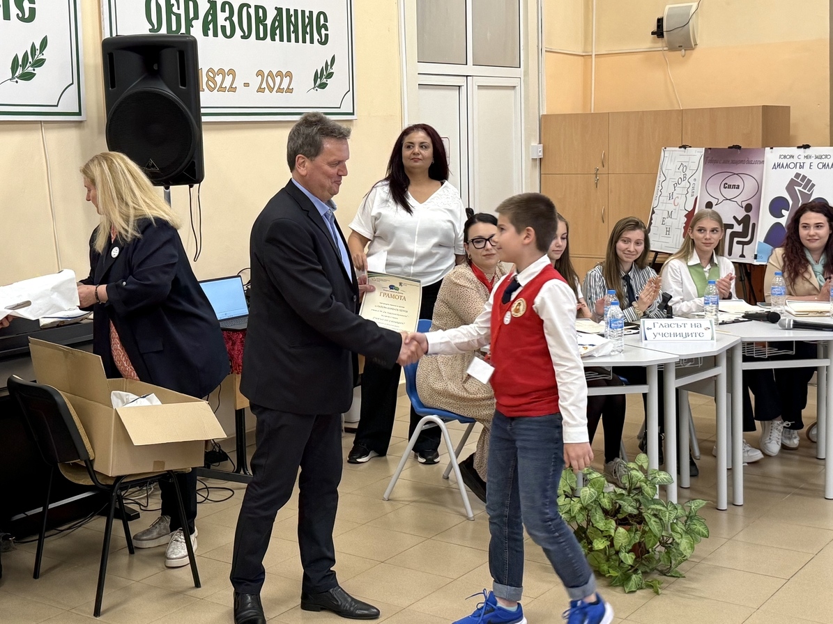 Събитието постави акцент върху умението да се води диалог – ключов фактор за изграждането на толерантна и подкрепяща училищна среда. Със своето участие Калоян Петров от 4.г клас достойно представи училището, демонстрирайки увереност, активна позиция и зряло отношение към темата. Неговото включване е пример за това, че децата могат да бъдат истински посланици на разбирателството, когато им се даде възможност да изразят своите мисли и чувства.